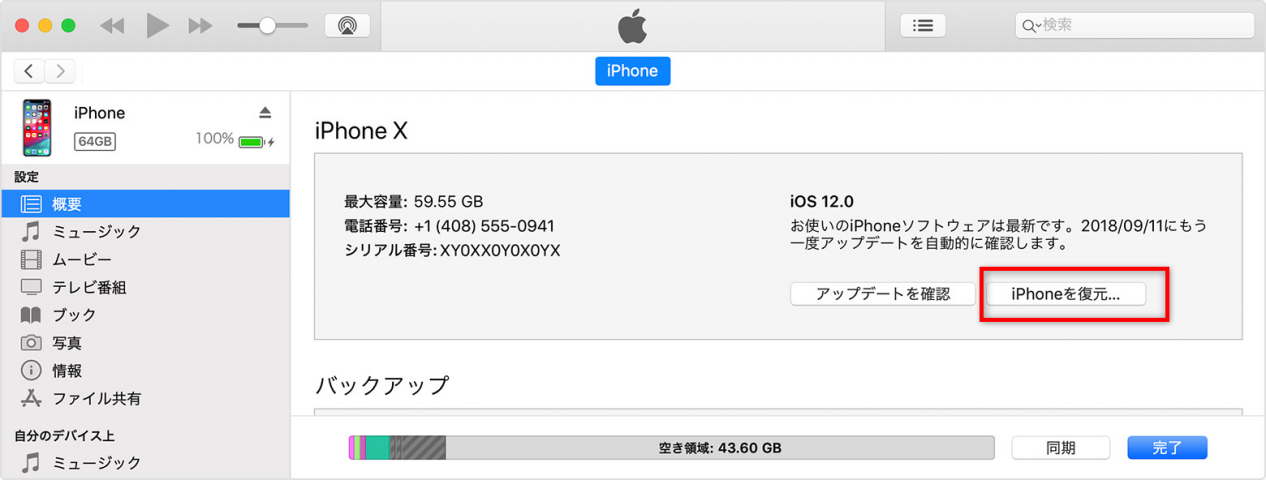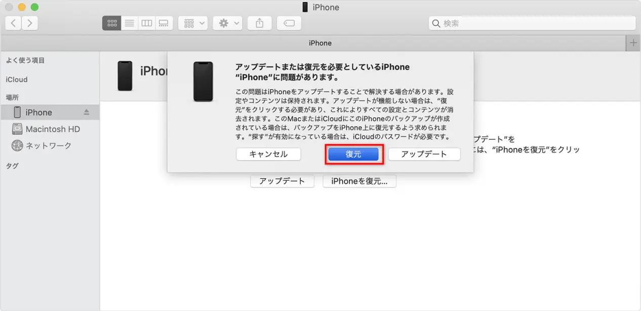 Step3、iPhoneをリカバリーモードに入りましたら、USBケーブルでiPhoneとパソコンを接続します。 以下の画面が表示されると、「復元」ボタンをクリックします。