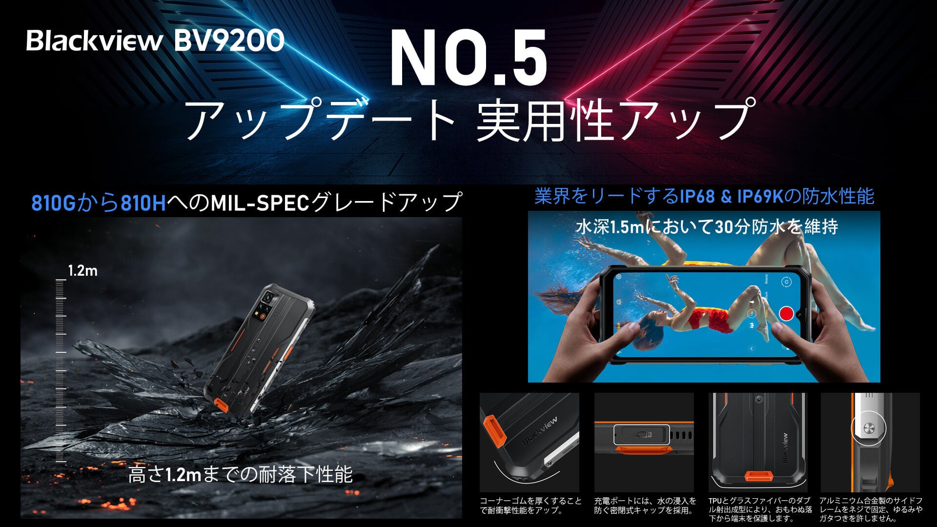 ブラックビューBV9200は、MIL-STD-810H認証を取得しており、高さ1.2mまでの落下に耐えうるボディを持ちます。