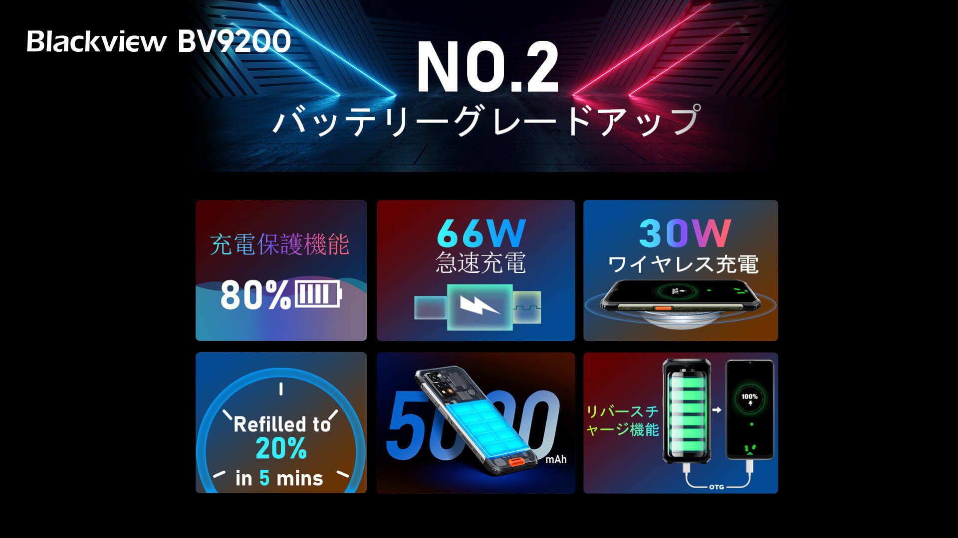 BV9200はArcsoftアルゴリズムの50MPメインカメラに、Harman AudioEFXサウンド、5000mAhバッテリーに66W有線&30Wワイヤレス充電、MediaTek Helio G96やDoke3.1搭載などの特徴があります。