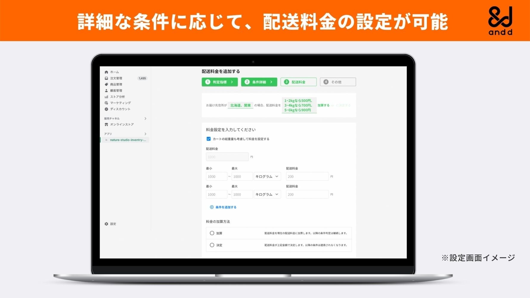 本アプリを利用することで、ストア運営者が、配送地域や発送方法、注文量などの様々な条件に応じて自由に配送料金を設定できるようになります。