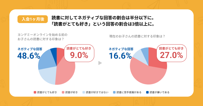 ヨンデミーオンライン入会者に対し、入会時と入会後1ヶ月経過時点に「お子さんは読書に対してどのような印象を持っているか」という質問を実施しています。