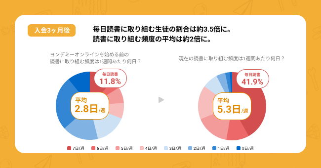 - 読書に取り組む頻度は、入会時は週あたり平均2.8日、入会後3ヶ月経過時点では入会時は週あたり平均5.3日と、約2倍に
