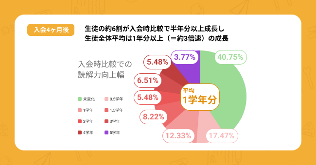 - 入会後4ヶ月が経過した生徒の約6割が入会時と比較して平均で半年分以上向上し、その成長速度は自由読書の約1.5倍に