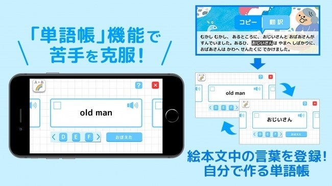絵本を読めば読むほど語学が身につく学習アプリです。世界の童話や日本の昔話、オリジナル作品と豊富なジャンルをお楽しみいただくことができ、毎月新しい絵本が追加更新されます。全ての絵本は音声と字幕テキストをいつでも日本語と英語に切り替えることができます。単語帳機能やシール帳機能といった学習の継続に役立つ機能も搭載しており、お子様から大人の方まで幅広く活用いただけます。