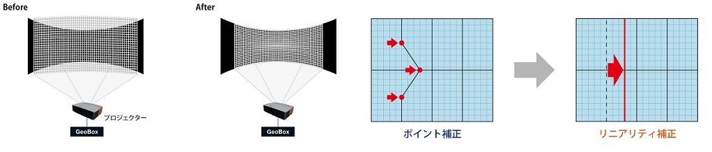 幾何学補正データを本体へ保存する手順が、従来モデル(ソフトウェア「GWarp3」)に比べ簡易化されました。さらに、幾何学補正の最大ポイント数がハードウェア本体とソフトウェアで同一となり、曲面スクリーンを使用する場合でも、本体で幾何学補正設定の微調整が可能です。リニアリティ補正も「GCT」から実行できます。