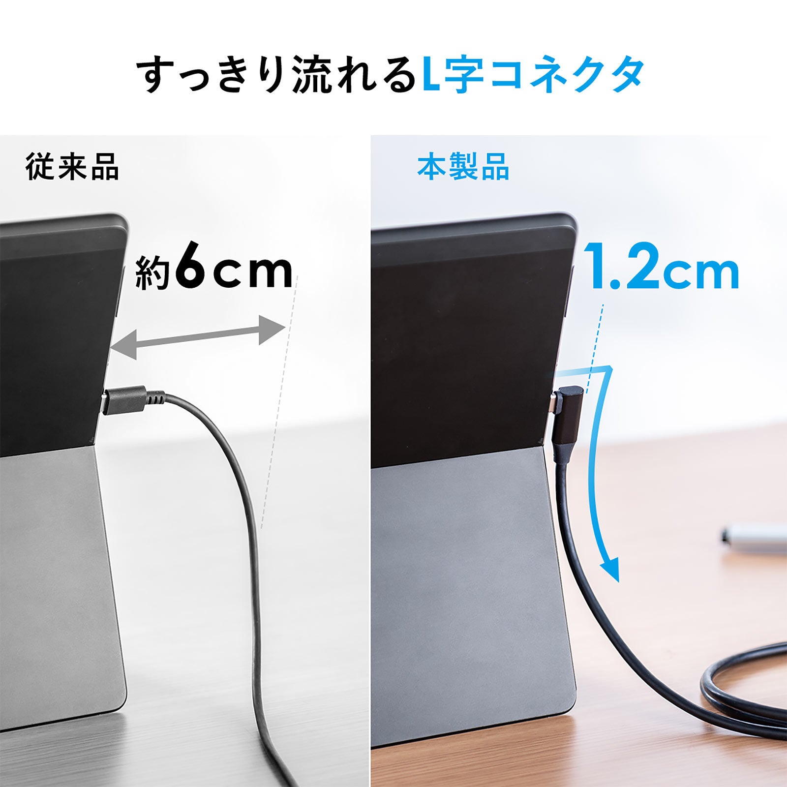 また、USB Type-Cコネクタは接続時に出っ張りが少なく、ケーブルが邪魔になりにくいL字型タイプです。