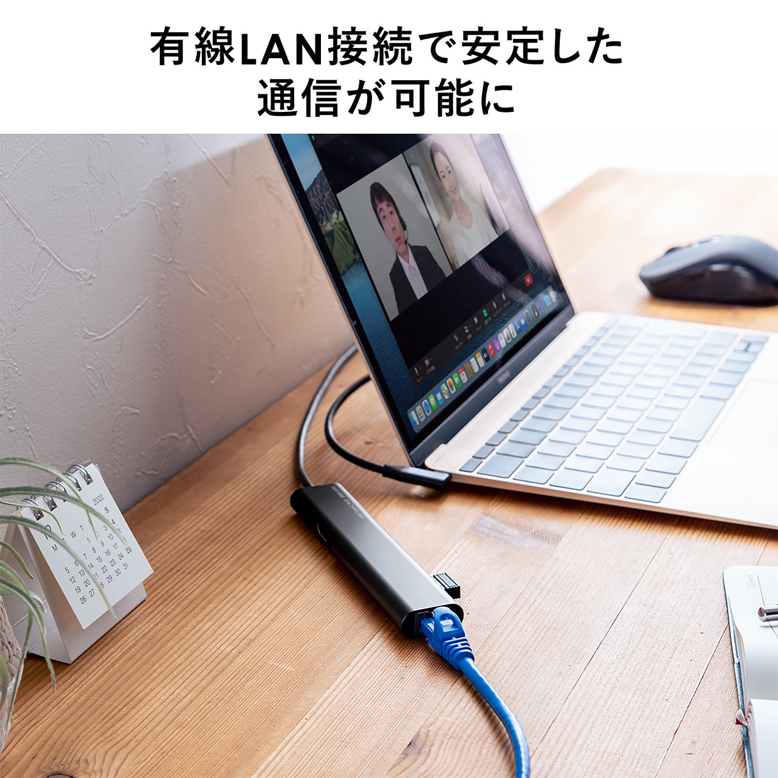 本製品は、ノートパソコンにUSB Type-Cケーブルを1本つなぐだけで、HDMIモニター、USB周辺機器、LANケーブルをまとめて接続できるモバイルドッキングステーションです。