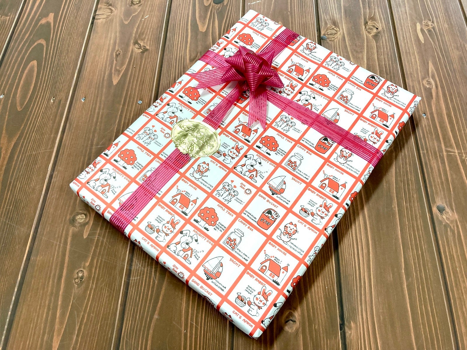 プレゼントは、シモジマの包装用品〈ストップペイル〉柄のラッピングが施されて届きます。