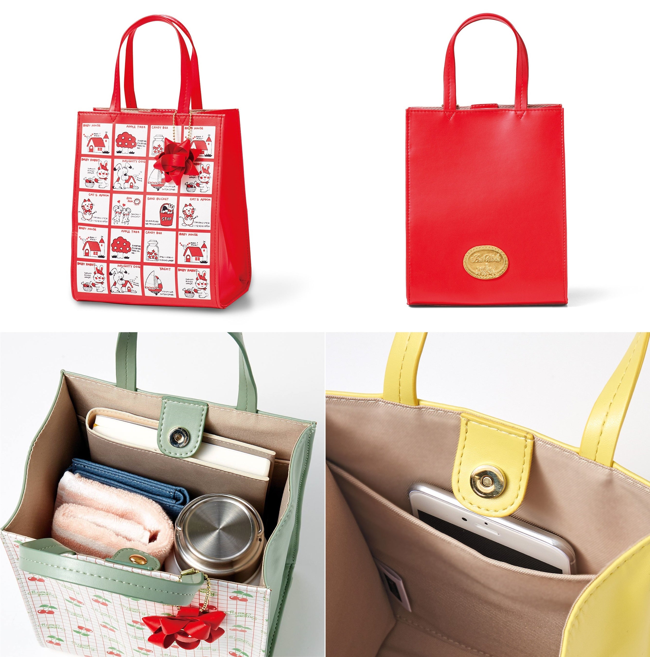 表面には、スターリボンのチャーム付きです。背面にはシモジマの金色の楕円形のシール、「Best Wishes」をイメージしたワンポイント入りです。内ポケットにはスマホなどを入れられるポケット付きです。まちがしっかりあるので、500mlのボトルやお弁当なども入ります。