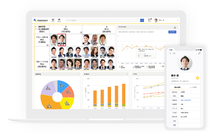 タレントマネジメントシステム「カオナビ」で、社員の顔や名前、経験、評価、スキル、才能などの人材情報を一元管理して可視化し、最適な人材配置や抜擢といった戦略的なタレントマネジメント業務の実現を支援。