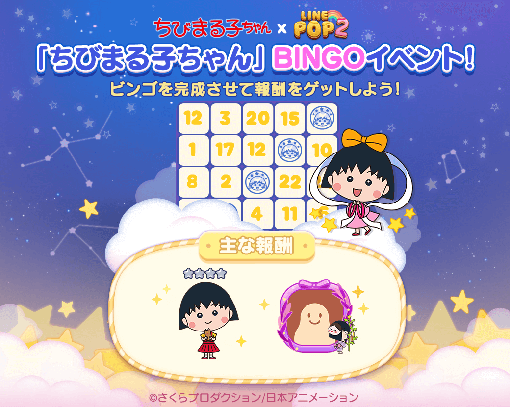 本コラボレーションを記念して、『ちびまる子ちゃん』のビンゴイベントを開催します。通常ステージをクリアして、すべてのビンゴをそろえると「★4 七夕のまる子」やプロフィールのデコレーションが楽しめるコラボ限定フレームとアイコン画像がもらえます。