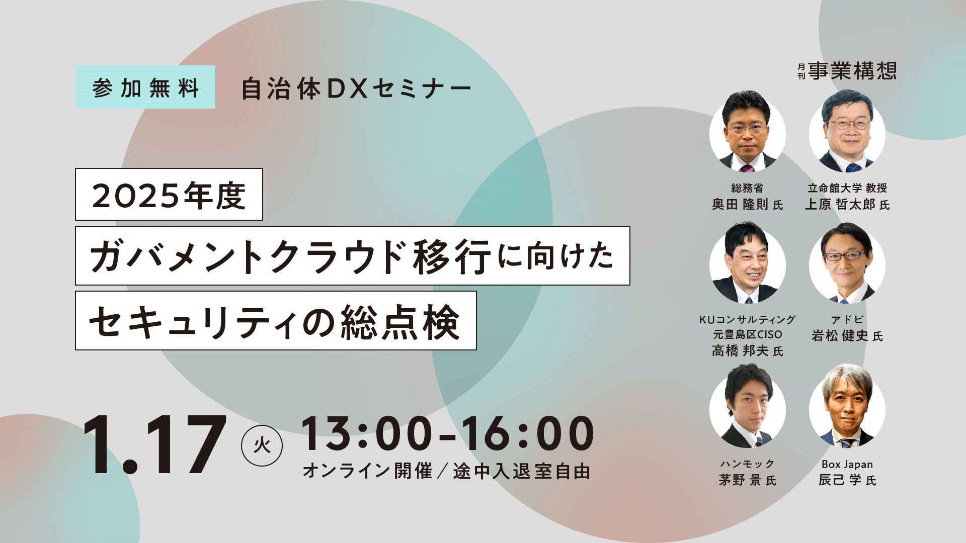 2025年度のガバメントクラウド移行と並行して自治体の情報セキュリティの見直しと強化はますます重要度が増しています。今回の自治体DXセミナーでは、総務省よりセキュリティポリシーガイドラインの改定について最新状況や今後の見通しを共有いただくとともに、各登壇者からは業務効率化とセキュリティを両立させた全国自治体での優良事例を具体的に紹介いただきます。