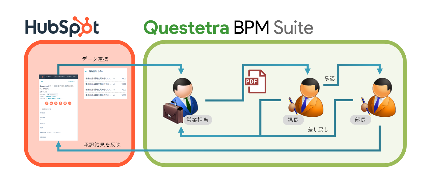 HubSpotとQuestetraの両者の得意な部分を組み合わせることで、クライアント様のニーズに合わせた複雑な承認ワークフローの実現が可能になります。