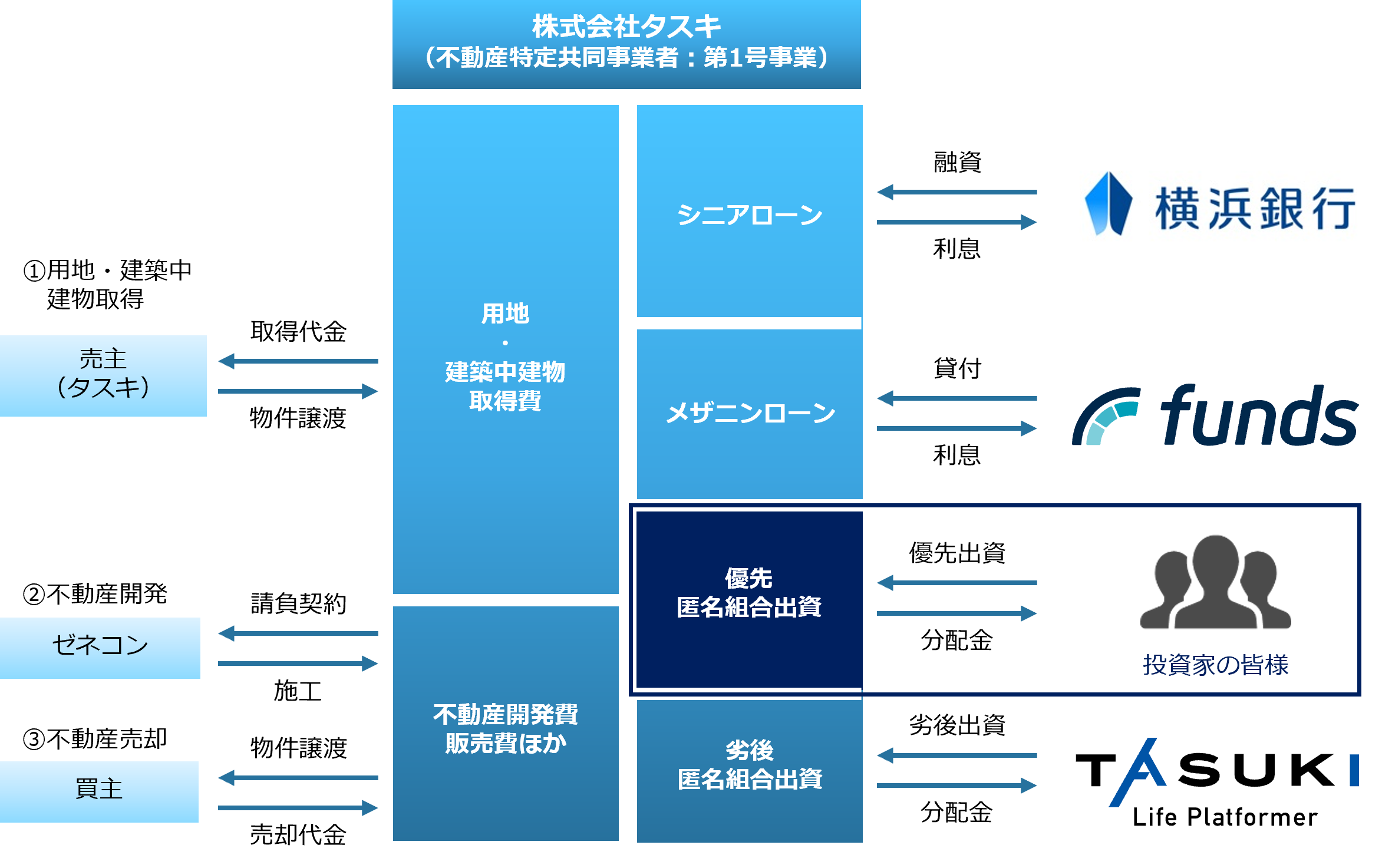 本ファンドは、本年9月竣工予定の上記不動産の売却代金を主な原資として投資家の皆様へ分配金の支払い及び出資金の償還を行います。なお、本ファンドにおける用地取得ならびに開発にかかる費用の一部は、匿名組合出資のほか、株式会社横浜銀行からのシニアローン及び株式会社ファンズ(以下、ファンズ社)が販売する貸付型ファンドのメザニンローンによって調達されています。ファンズ社を通じた資金調達については、2022年5月9日付当社リリース(※)にて発表しておりますファンズ社と当社の協業の一環となります。