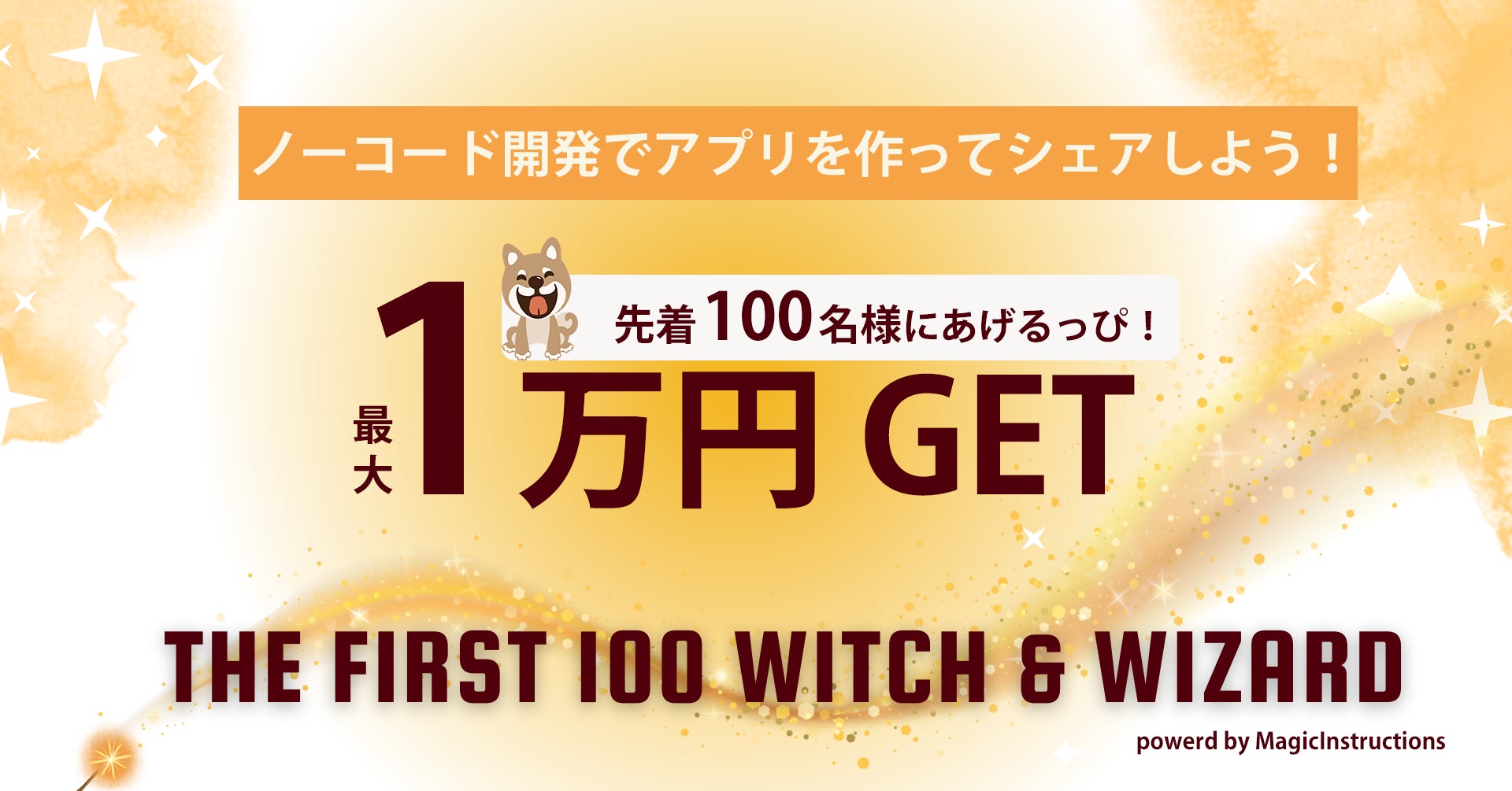 本キャンペーンでは、ノーコードアプリ制作プラットフォーム**【MagicInstructions】**で制作したオリジナル業務用アプリをシェア(販売)してくれたユーザー様に、先着100個まで最大1万円の追加報酬をお支払いします。
