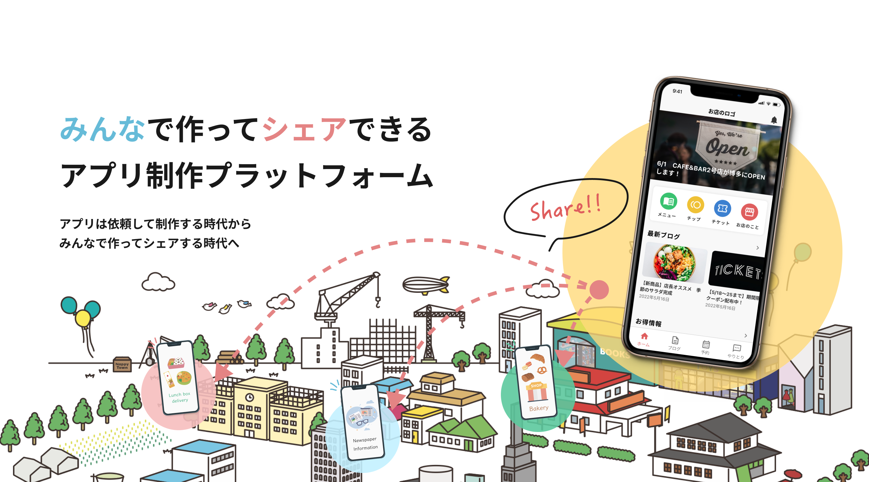 先行ユーザーが制作したアプリを、他のユーザーが雛形として使えるようにシェア(販売)することで、業務、職種、業界や従業員規模などによって細かく異なる様々な要件を満たした、たくさんの「アプリの素」をみんなで制作します。