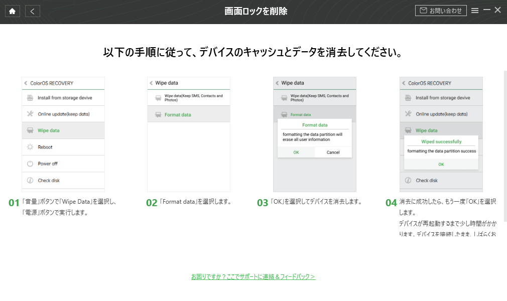 4> キャッシュとデータの消去が完了すると、画面ロック解除が開始されます。少し時間がかかりますので、しばらくお待ちください。解除プロセスが完了すると、デバイスが起動されて、「解除しました」の画面が表示されます。