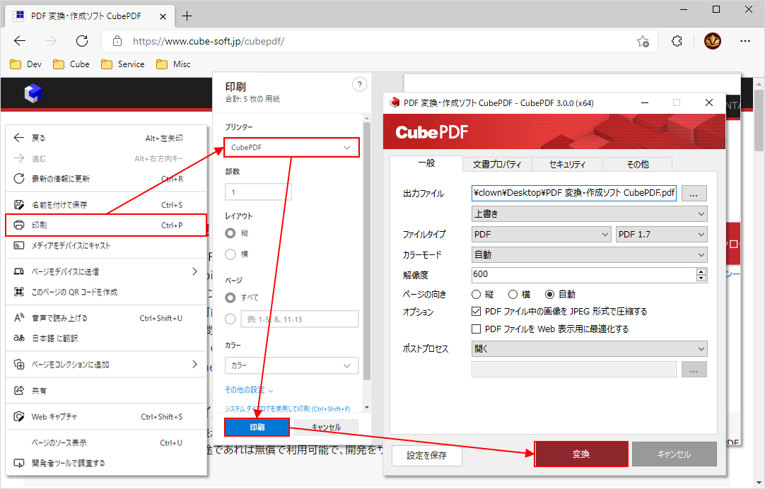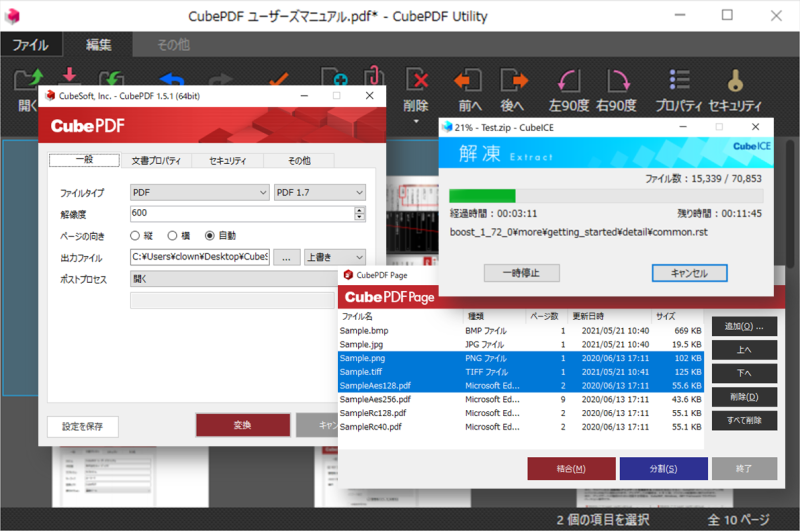 Windows の印刷機能を利用した仮想プリンター形式の PDF 変換・作成ソフトです。 それぞれのアプリケーションで印刷ボタンを押す際に CubePDF プリンタを選択することによって、 紙に印刷する代わりに PDF に変換されます。 印刷可能でさえあれば、変換元のファイル形式は問いません。 また、PNG や JPEG などの画像ファイルにも変換することができます。