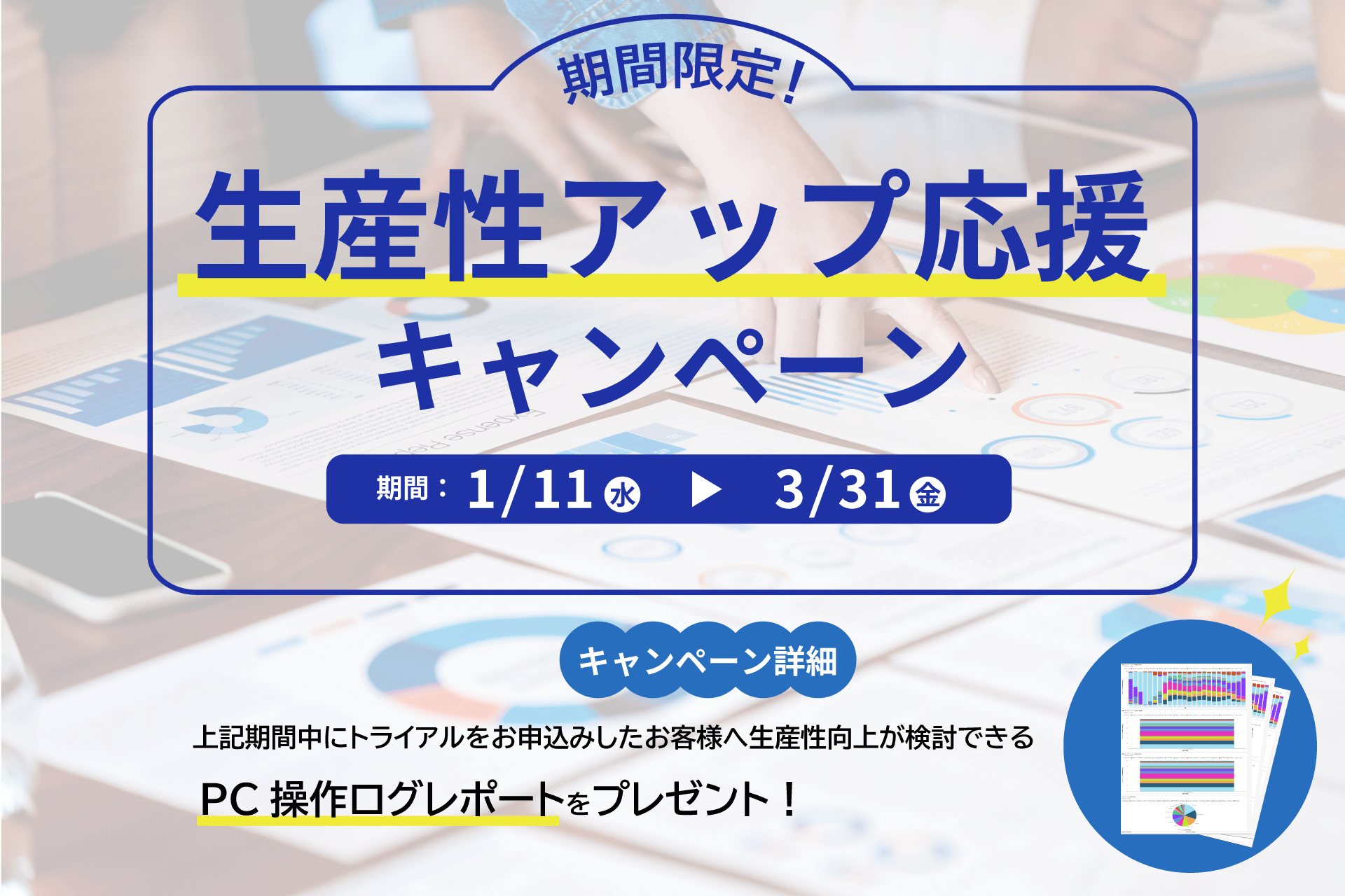 そこで、「NEC働き方見える化サービス Plus」では、PC操作ログを従業員の働いた時間の活用だけでなく、組織の働き方を確認して業務改善や効率化への活用を実感していただくため、「生産性アップキャンペーン」を実施します。
