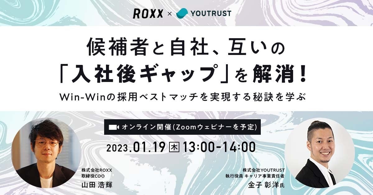 そこで本セミナーでは、日本のキャリアSNS「YOUTRUST」を運営する株式会社YOUTRUSTより執行役員/キャリア事業責任者として同社のビジネス戦略を担う金子彰洋氏をお招きし、弊社 取締役COO 山田とともに「候補者と自社、双方の視点から入社後のミスマッチを防ぐ方法」や「自社で活躍する人材を採用するために企業がすべきこと」などについてお話します。
