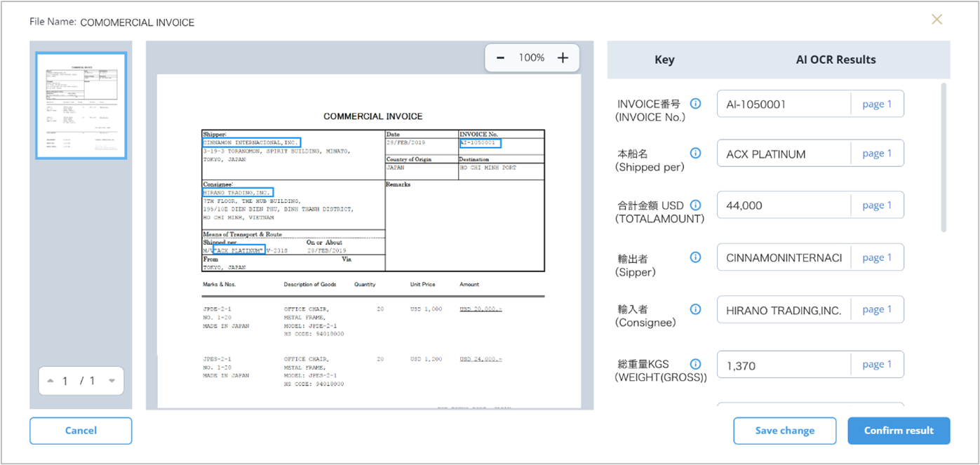 「Flax Scanner for 貿易書類」は、輸入時に発生する貿易書類(Invoice、包装明細書[Packing List]、船荷証券[Bill of Lading]など)を、シナモンAIが開発した専用AI-OCRモデルによって、90%以上(*1)の高精度で読み取り、テキスト化することが可能です。