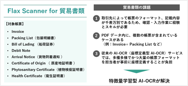 シナモンAIの「Flax Scanner for 貿易書類」は、特徴量学習型AI-OCR(*2)を採用しており、入力担当者の座標定義が不要となるほか、帳票の自動分類・分割にも対応するため、大幅に作業を効率化することが可能となります。