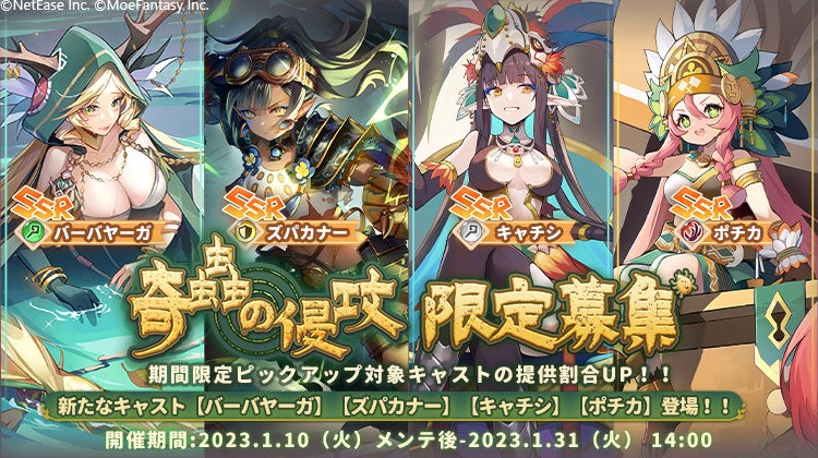 限定SSRキャスト「バーバヤーガ」「ズパカナー」「キャチシ」「ポチカ」は、イベント限定募集で登場します。新キャラを入手できるのは今だけ!