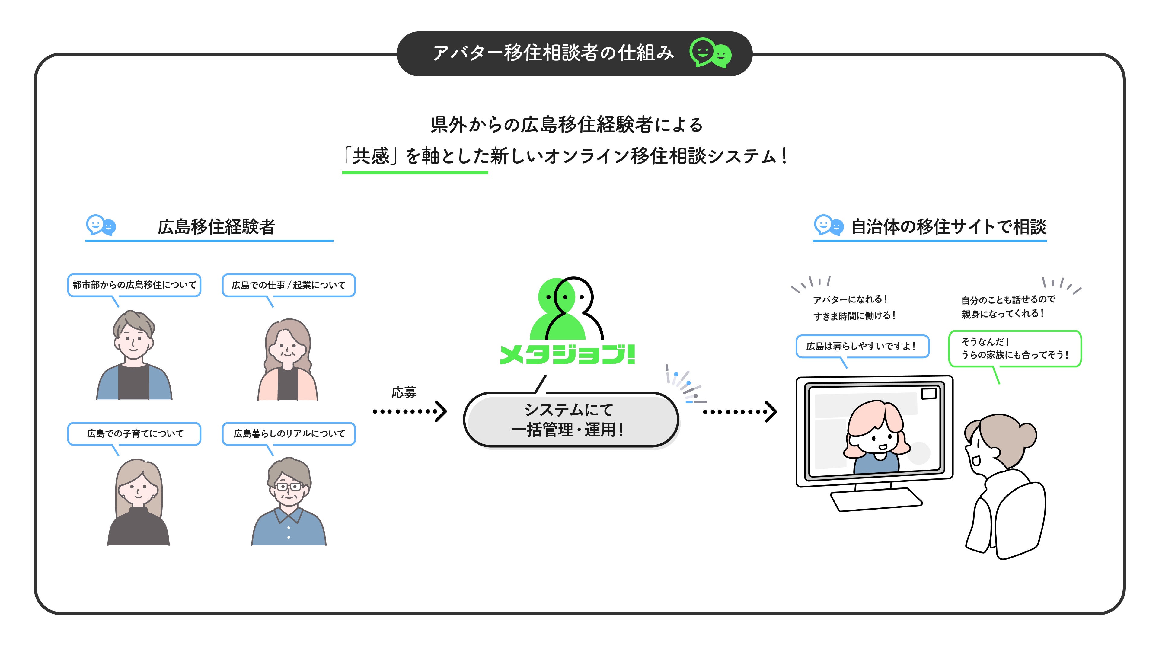 そこで、メタジョブ!が提供するアバター相談員の仕組み活用により「より多くの相談者への対応」「共感性の高い個別相談」の実現について検討を進めています。