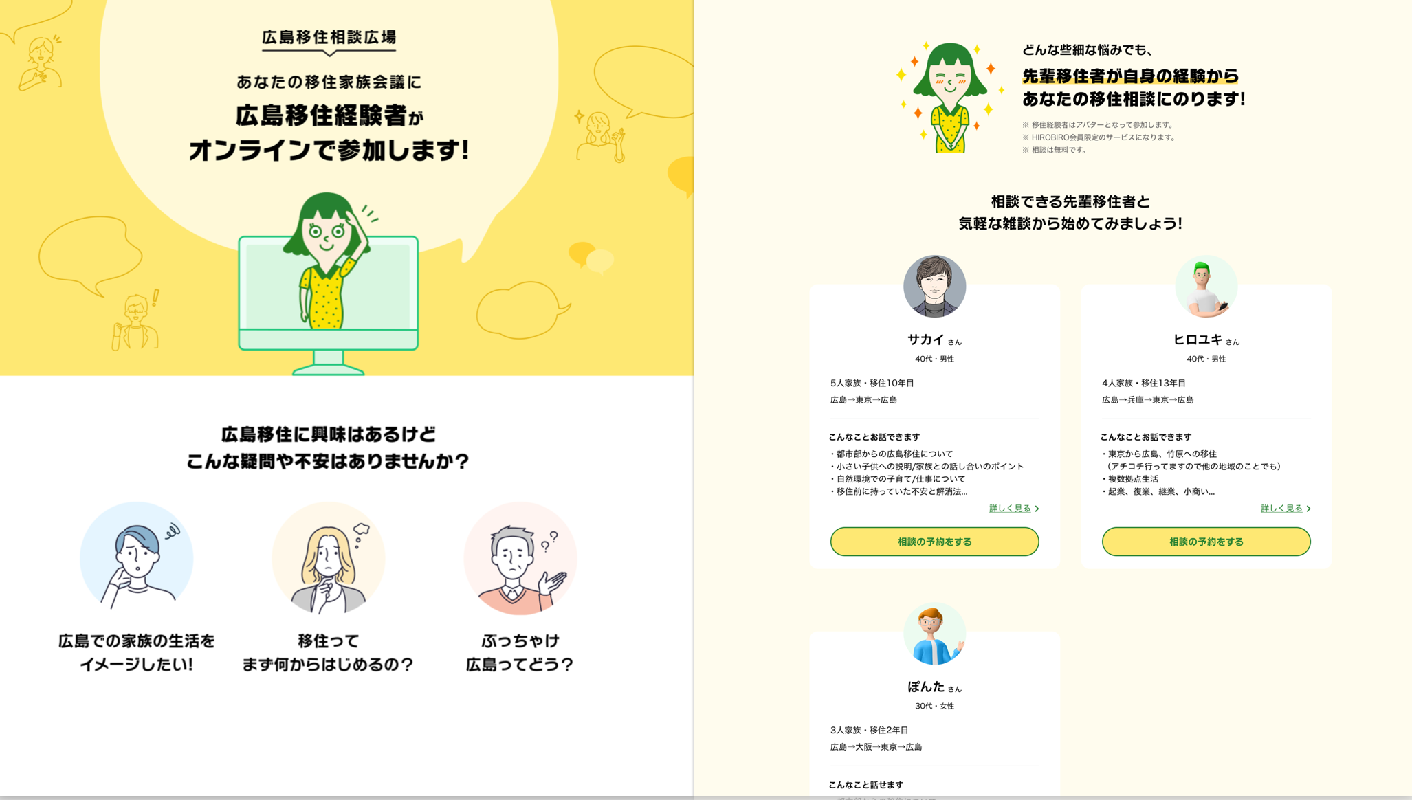 一般の広島移住経験者4名がアバター相談員となり、自身の移住経験に基づいたアドバイスや相談者のライフスタイルに応じた広島暮らしのリアルを個別に伝えます。