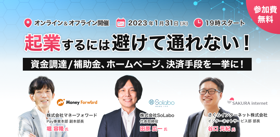 それぞれの分野において実際の立ち上げ期のユーザーをたくさん見てきた3社だからこそお伝えできる「資金調達」「ホームページ制作」「決済手段」について徹底解説いたします。