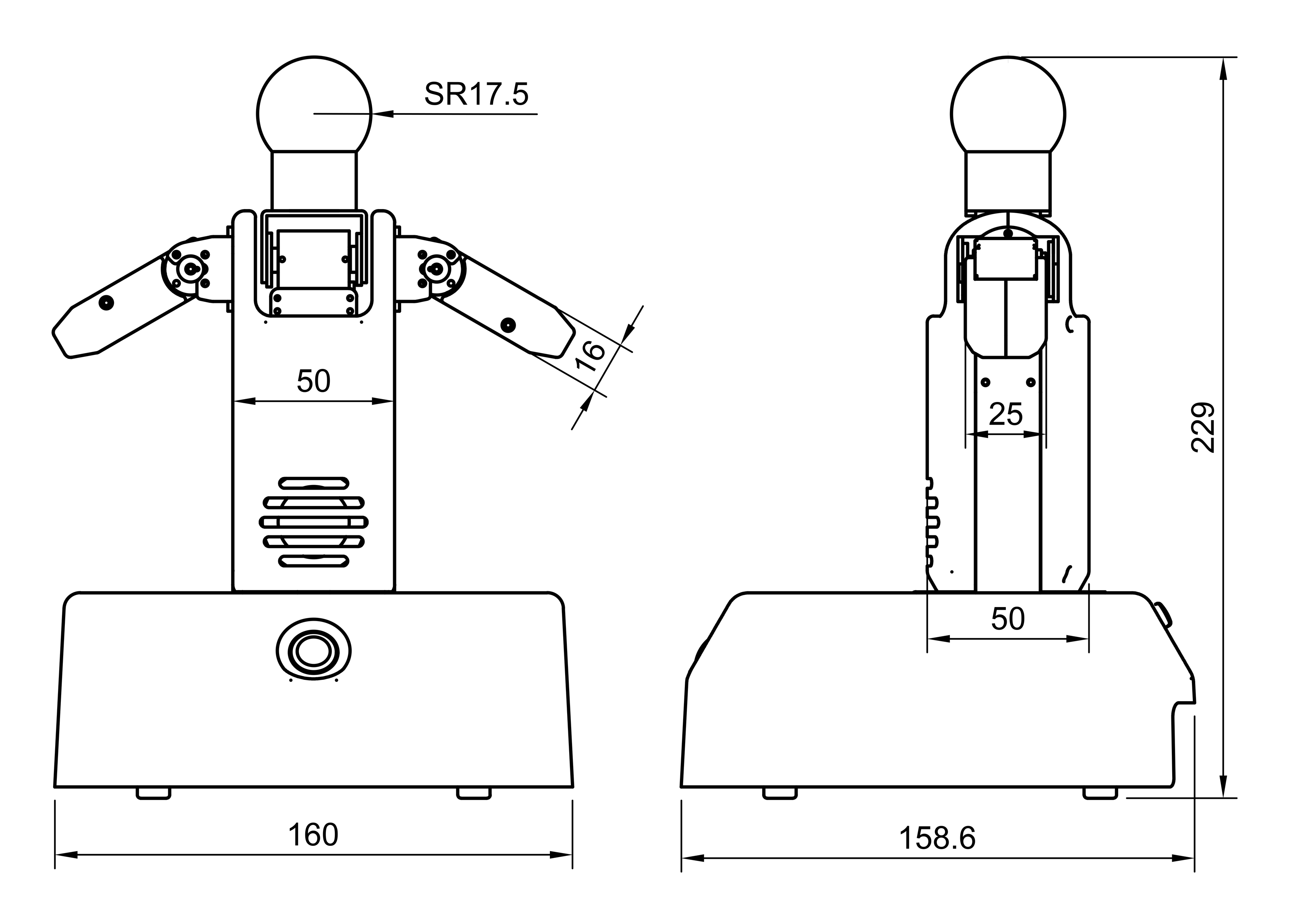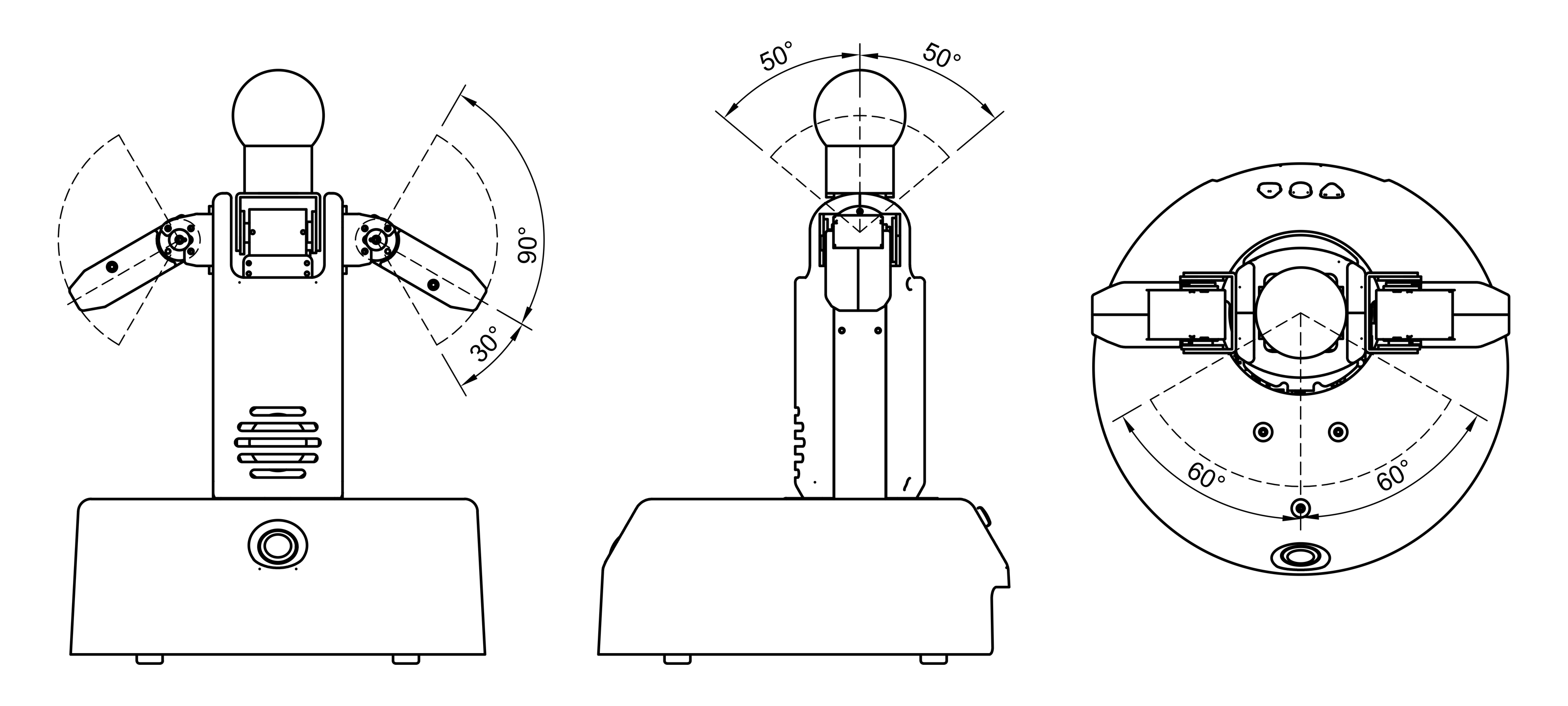 | 動作角度 | ID1(胴体ヨー軸):-60度~+60度 ID3(右腕ロール軸):-90度~+30度 ID5(左腕ロール軸):-30度~+90度 ID7(首ピッチ軸):-50度~+50度 |