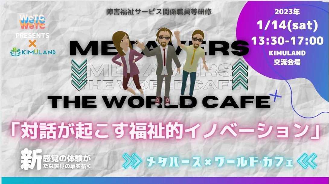 この研修は障害福祉サービス従事者に向けたものであり、WeTCのイベントしては初のメタバース開催です。本研修はメタバース空間において、リラックスした雰囲気で参加できるワールド・カフェの形式をとり、参加者は自由なアバターの姿で参加しディスカッションなどを行う予定です。