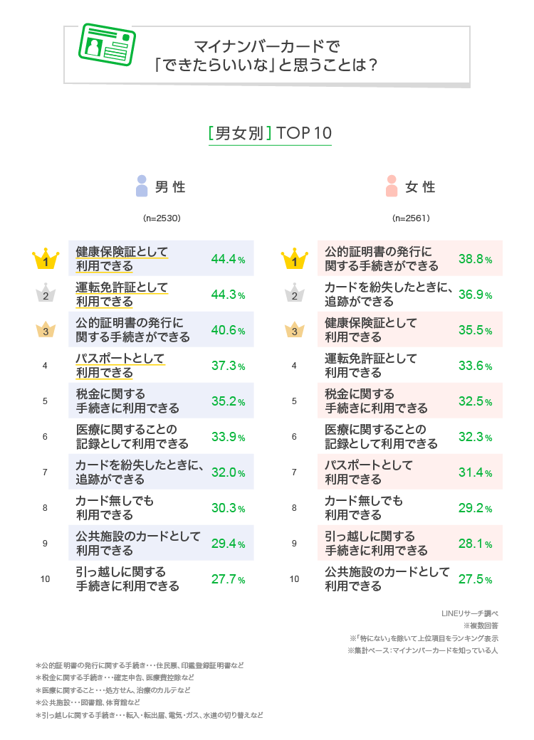 「健康保険証として利用できる」「運転免許証として利用できる」「パスポートとして利用できる」といった、身分証明書の代わりになるという項目は特に男性の割合が高くなりました。
