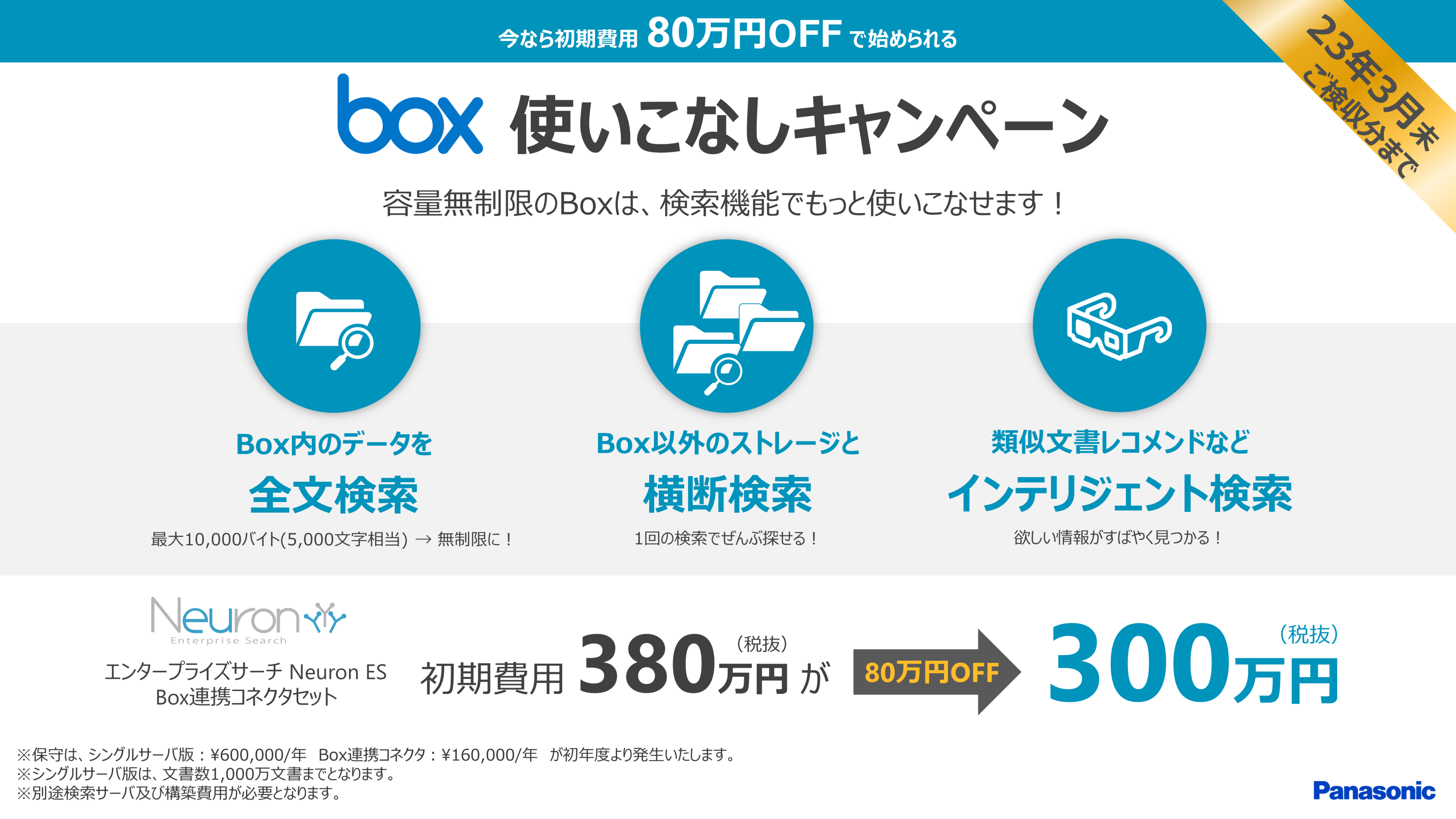 - エンタープライズサーチ「Neuron ES」Box連携コネクタセット 初期費用380万円(税抜)を、通常価格より80万円OFFの300万円(税抜)にてご提供いたします。