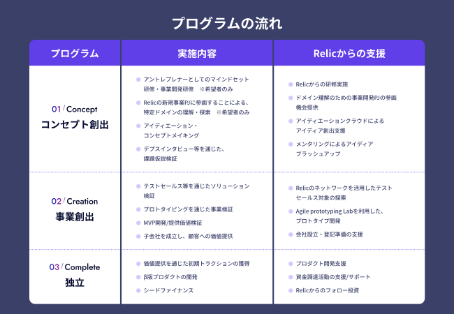これまで3,000社・15,000件以上の新規事業開発を行ってきたRelicグループのアセットを活用しながらスタートアップとしての事業開発に挑戦するプログラムです。会社員としてRelicグループで雇用や給与を保障された状態で事業検証活動を行い、最終的にはカーブアウトしてオーナー創業者としての独立を目指します。