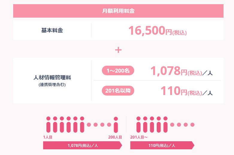 Linkusの月額利用料金は、基本料金16,500円(税込)、人材情報管理費として1人につき、1~200名までは1,078円(税込)、201名以上からは110円(税込)となっています。