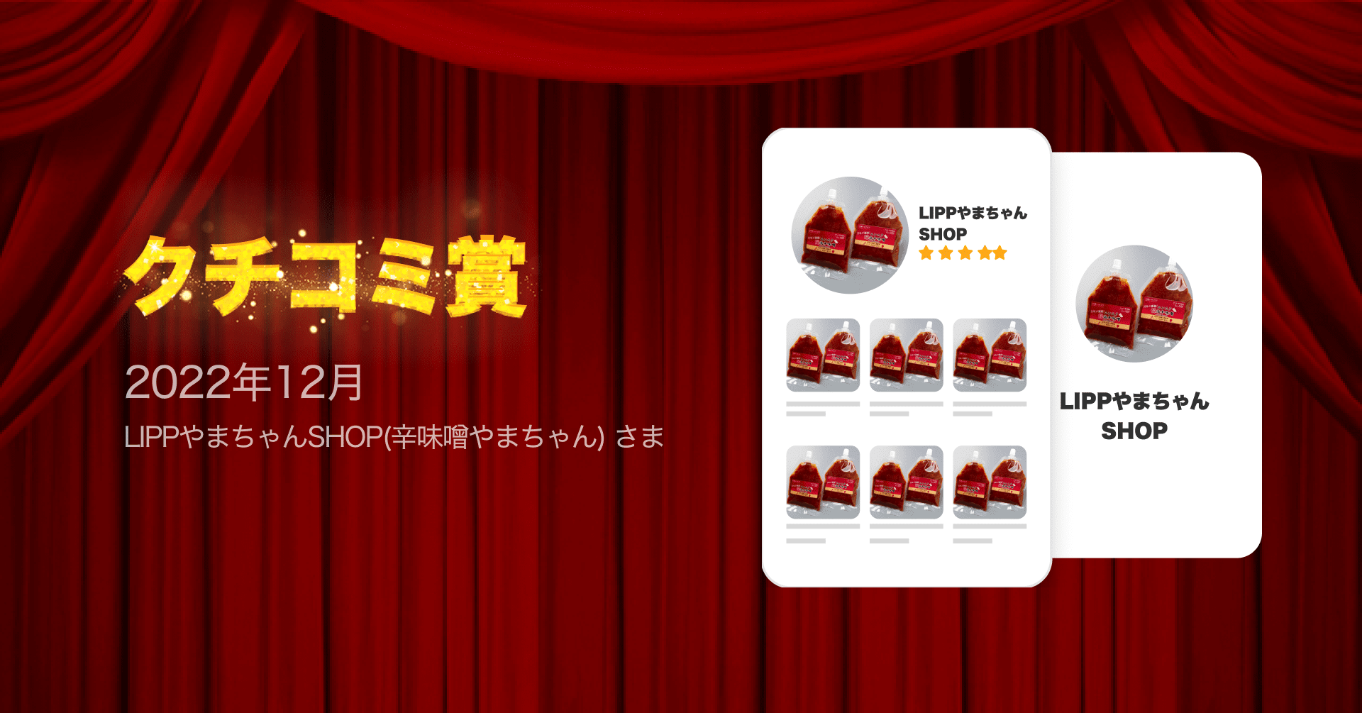 2022年12月度のクチコミ賞として、福島県会津若松市で超激辛にんにく辛味噌を製造・販売している「LIPPやまちゃんSHOP(辛味噌やまちゃん)」様を選出いたしました。また準クチコミ賞を下記の通り選出しています。