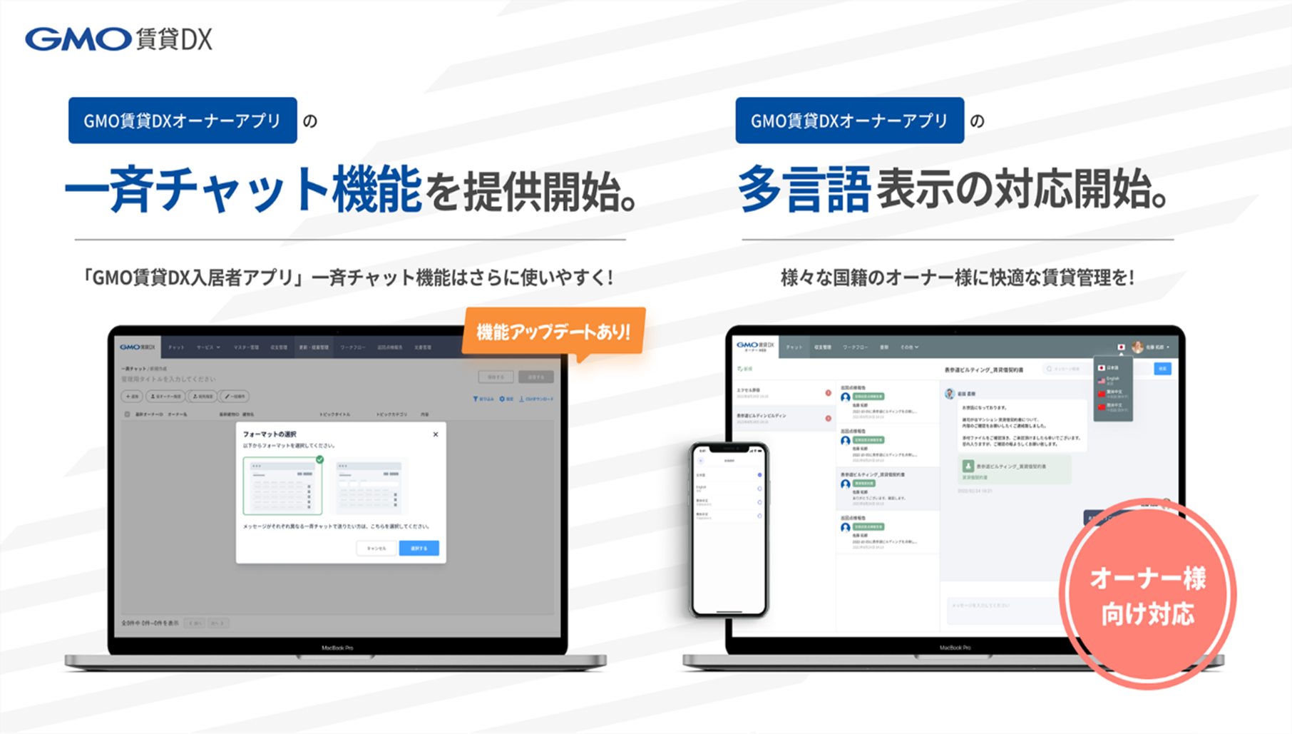 また、「GMO賃貸DX オーナーアプリ」に加え、従来『一斉チャット』機能を提供していた「GMO賃貸DX入居者アプリ」においても「タグ」機能を実装しました。これにより、オーナー様/入居者様の属性を設定し、一人ひとりに適したチャットを送信することができるようになります。