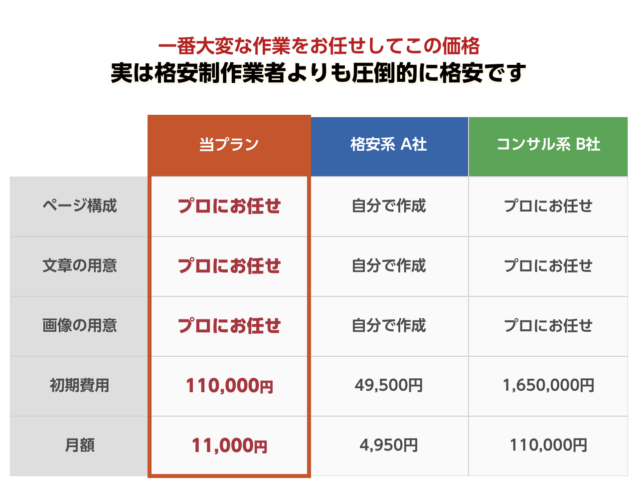 サービス内容で比較すると、デザインなどの外枠のみを提供するサービスと比べ、圧倒的に格安の料金です。