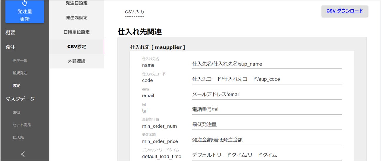 「α-発注」上の「CSV設定」画面にて、「α-発注」で受け入れるCSVファイルの各カラム名を自由に変更できます。