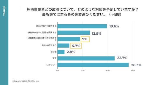 免税事業者との取引について、課税事業者への登録を要請するとの回答が9.0%、取引を終了するとの回答が4.7%と、一定数は何らかの取引の見直しをするという回答結果となりました。