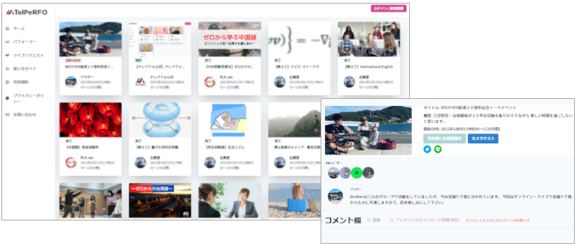トップページと配信画面例(イメージ画像) URL https://www.telperfo.com