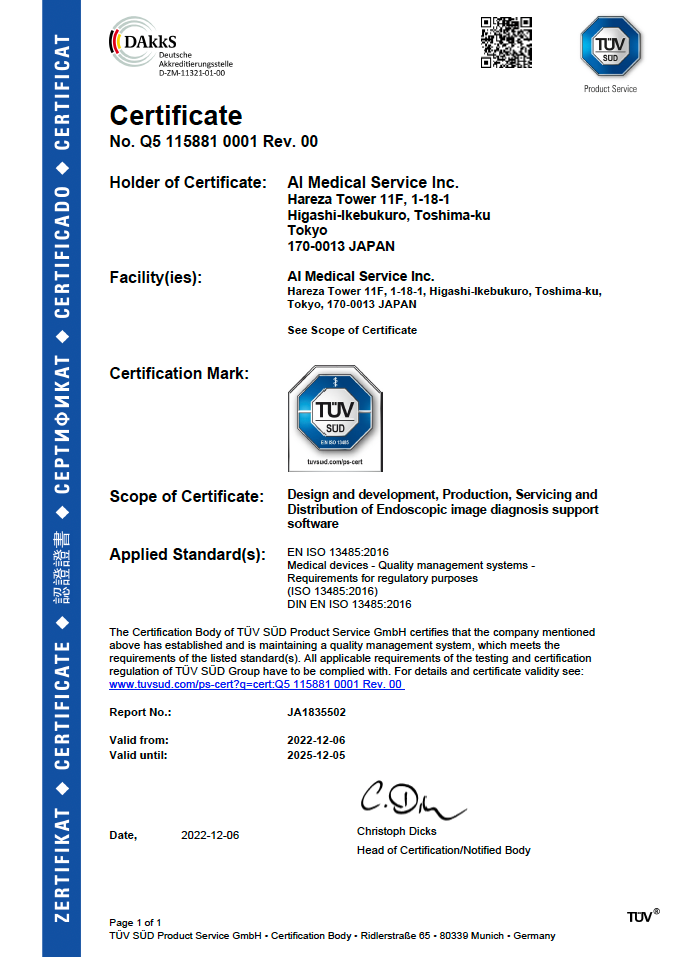 ISO 13485は、医療機器の安全性と有効性および品質の維持をねらいとした国際規格で、医療機器の設計・開発・製造・販売等にたずさわる組織を対象としています。医療機器メーカーが安定した医療機器及び関連サービスの提供を保証することを目的として作られており、同認証を取得することは、AIMが日本のみならず海外においても世界基準のマネジメントシステムに準拠した開発を行なっていることの証明になります。