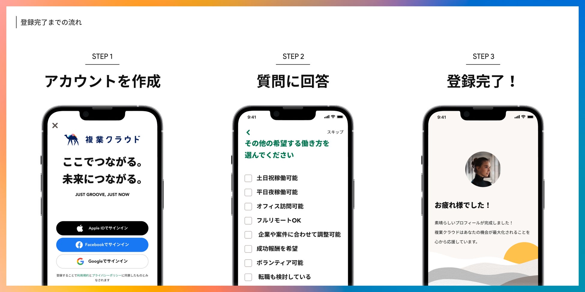 タレントが複業クラウドに登録する際は、職種/スキル/ご自身の現在の働き方/希望する単価や働き方/プロフィール情報などをタップで選ぶだけで完了です。登録から利用まではわずか約2分しかかからないため、すぐに複業先に出会うことができます。また、企業からのスカウトが届くこともあるので、登録するだけで複業の機会を最大化させることができます。