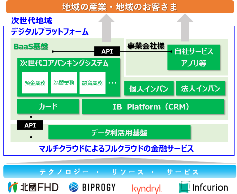 株式会社北國フィナンシャルホールディングス(本店:石川県金沢市、代表取締役社長:杖村修司 以下北國FHD)は、BIPROGY株式会社(本社:東京都江東区、代表取締役社長:平岡昭良 以下BIPROGY)、キンドリルジャパン株式会社(本社:東京都中央区、代表取締役社長 上坂貴志 以下キンドリルジャパン)、株式会社インフキュリオン(本社:東京都千代田区、代表取締役社長:丸山弘毅 以下インフキュリオン)と共同でマルチクラウドによる次世代地域デジタルプラットフォームの構築を目指した検討プロジェクトを開始することをお知らせします。