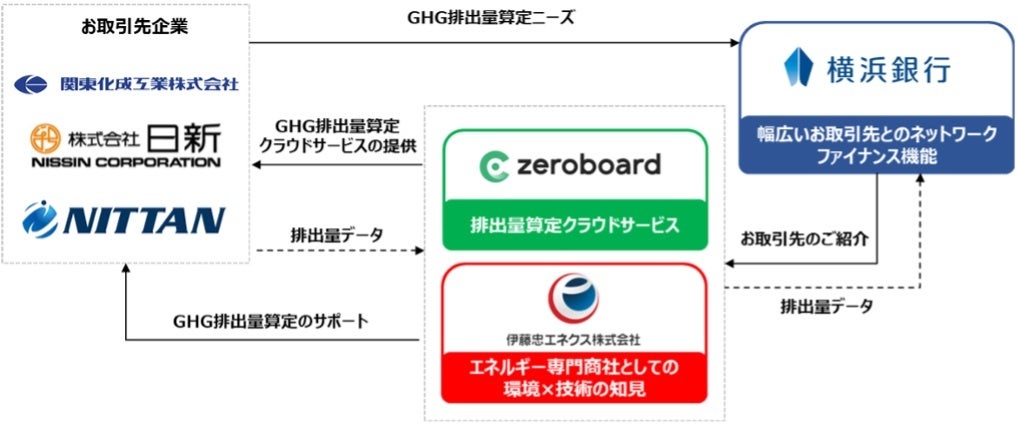 我々3社は実証実験の結果を踏まえ、さらに発展させた取り組みを開始いたします。横浜銀行の取引先企業である関東化成工業株式会社、株式会社日新、株式会社NITTANに対して、伊藤忠エネクスのGHG専門家としての知見を活かした高度なSDGs事業性評価を実施します。これにより、GHG排出量算定・可視化を支援し、その先にあるGHG削減に向けた具体的なソリューション提案の手がかりとなることが期待されます。