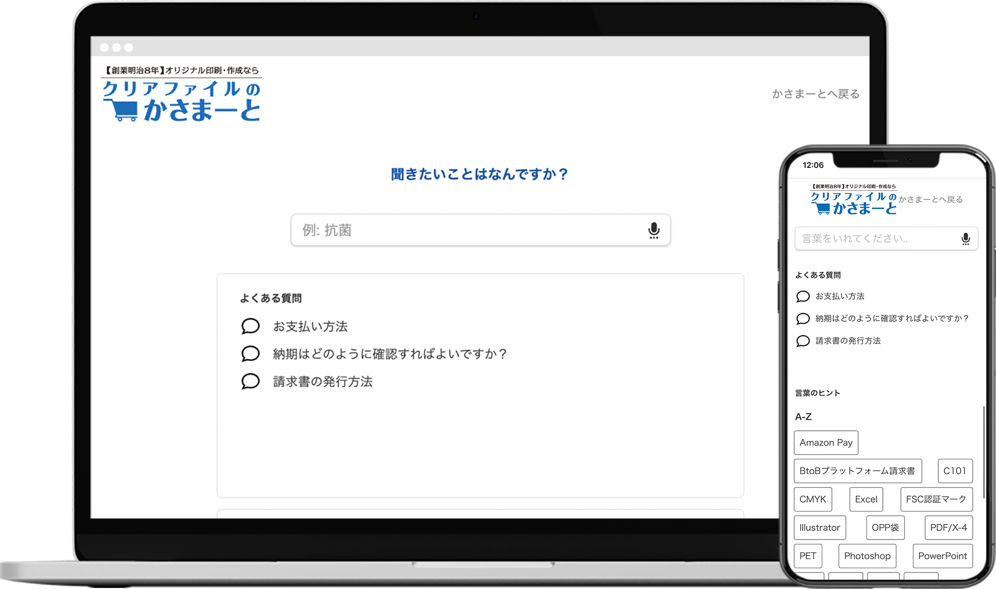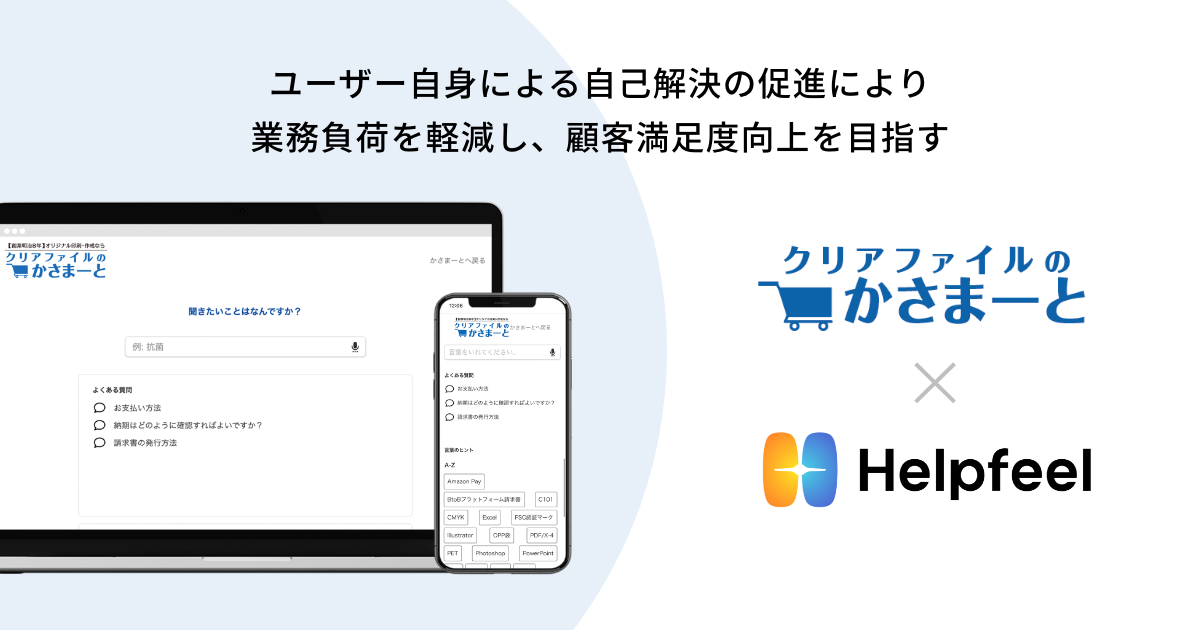 「クリアファイルのかさまーと」の毎月の問い合わせ数は500~1000件ほどにのぼっていました。5人の専任スタッフを配置し、顧客対応を行なってきましたが、特に電話による問い合わせに業務負荷がかかり、ユーザー自身による自己解決の手段を探していました。笠間製本印刷はこれらの課題を根本的に改善するために、革新的なFAQシステムである「Helpfeel」を導入。FAQで解決できる質問や問い合わせはHelpfeelでユーザー自身で自己解決し、空いたリソースで有人対応すべき電話問い合わせや見積依頼にスピーディに対応する仕組みを設計しました。自己解決しやすい仕組みを構築することで、カスタマーサポート担当者の負担軽減と、顧客の利便性、満足度の向上を目指します。