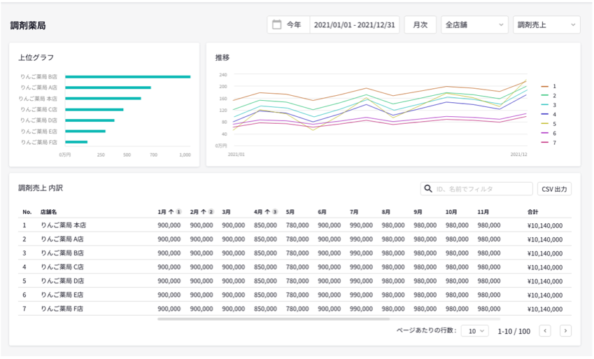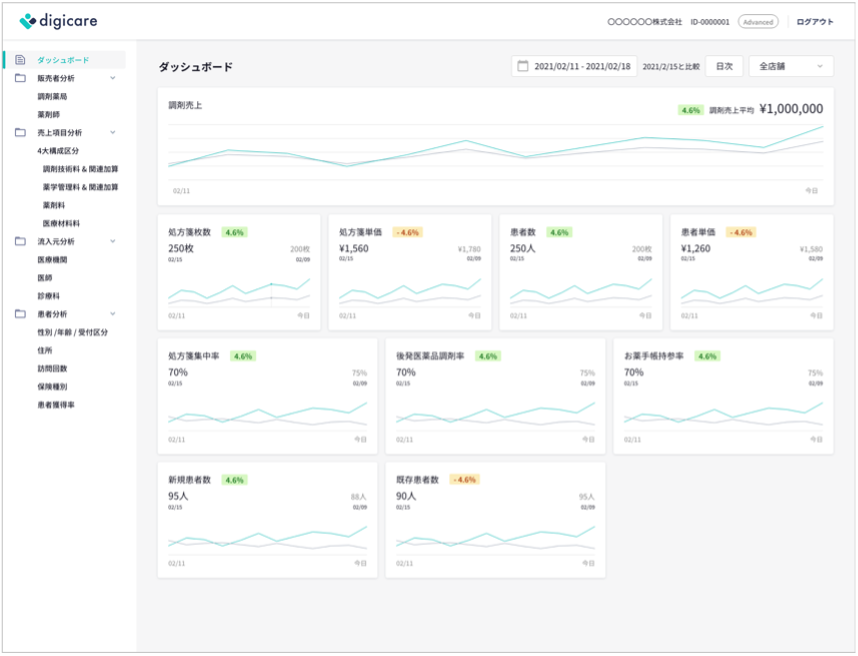 「digicareアナリティクス」は、調剤薬局における売上データの収集・集計を自動化し、日々の集計業務にかかる手作業を大幅に削減します。お使いのレセコンがPHC製以外であっても対応ができ、また、導入に際してシステム開発が必要ないため、スピーディーに利用開始できます。さらに、クラウド上にリアルタイムでデータ保存をするため、お手元の端末を使って、どこからでも最新の情報にアクセスすることが可能です。