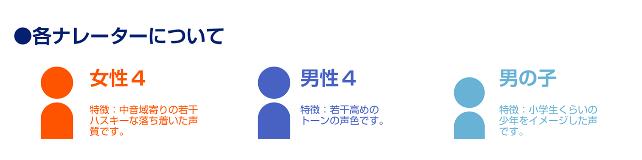 新たに発売する話者は「女性4」「男性4」「男の子」の3話者です。
