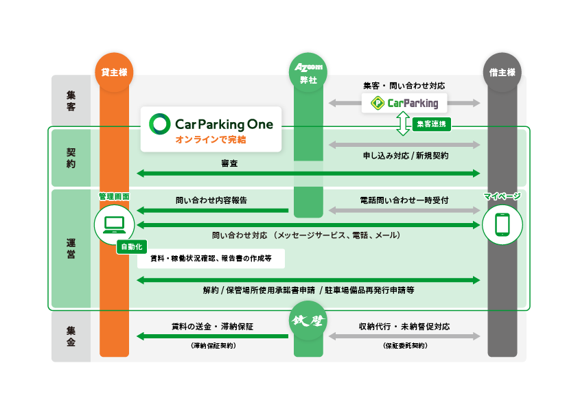 「CarParking One」は、集客から申込・契約の締結、契約管理までをオンライン上で完結できるクラウドシステムです。